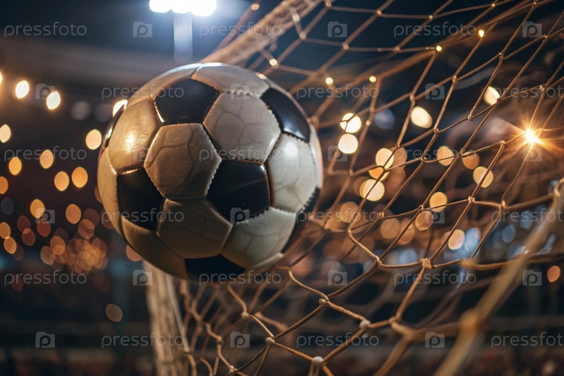 Футбольный мяч в ворота, среди сверкающих огней и размытого фона