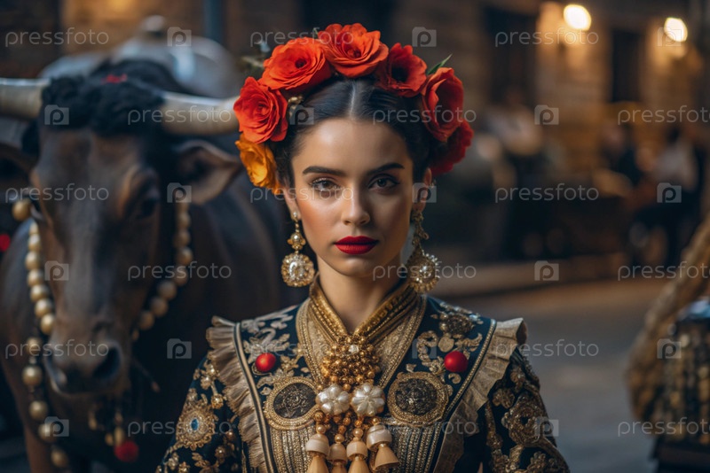 Испанская девушка в традиционном испанском национальном костюме. Перед быком. Бикоборство. Портрет символизирует традиции и культуру народа Испании