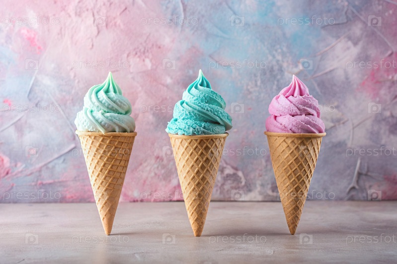 сладкий десерт. морозильные шишки разных вкусов. синий, розовый и фиолетовый мороженое на фоне трех пастельных цветов: синего, розового и фиолетового