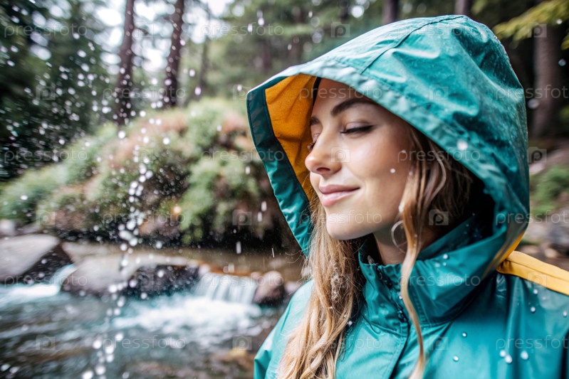 Счастливая молодая женщина в плаще наслаждается дождем на фоне зеленого леса, концепцией наслаждения естественной спокойной жизнью, окружающей средой, образом жизни