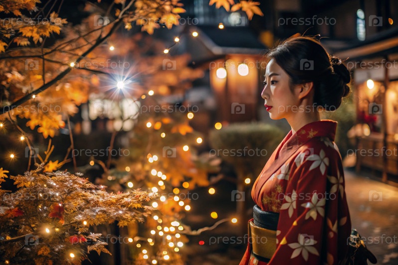 Японская девушка в традиционном национальном костюме - кимоно. На сказочном фоне фонарики и осенние деревья. Портрет символизирует традиции и культуру народа Японии