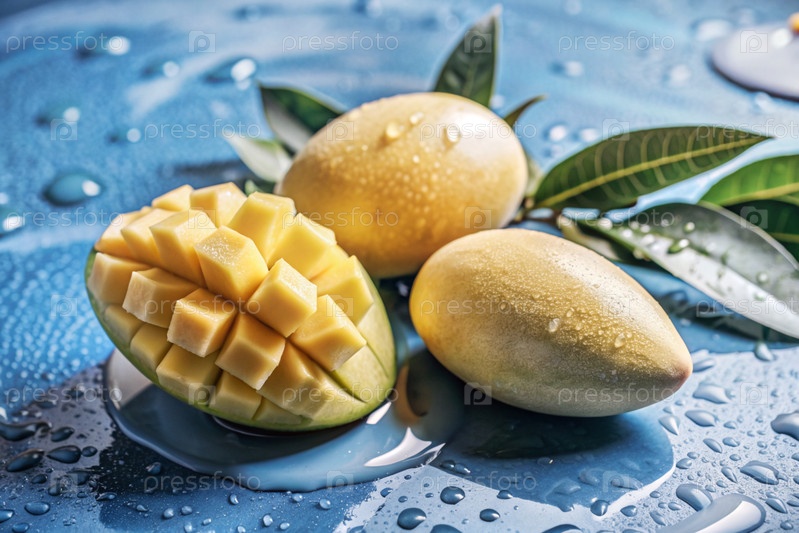Свежие манго. Вкусные ягоды и фрукты ярко-желтого цвета с капельками воды. Вегетарианство. Здоровое питание. Свежий плод на столе