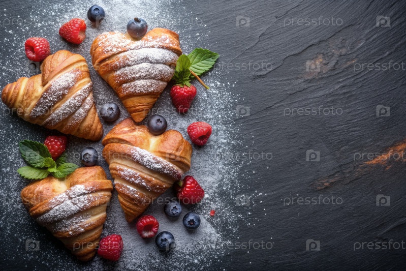 Вкусные свежевыпеченные кроассанты и ягоды в форме сердца на тёмном фоне сланцевого камня. французский завтрак. хорошие ближневые выпечки. пекарня со вкусным хлебом. кондитерские изделия