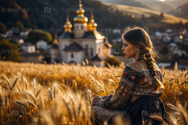 Молодая девушка в льняном платье на фоне поля спелых золотых пшениц и православной церкви при закате солнца