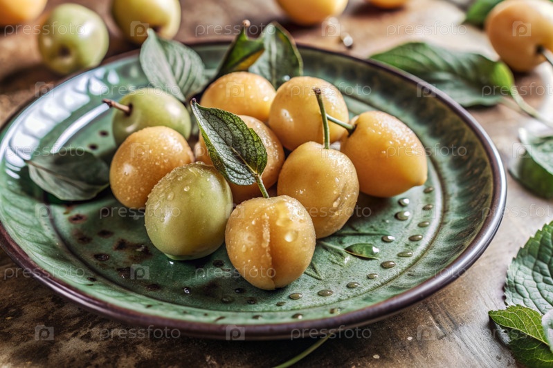 Закрытие свежих слив. Вкусные ягоды и фрукты ярко-желтого и фиолетового цвета с капельками воды. Вегетарианство. Здоровое питание. Свежие плоды на столе
