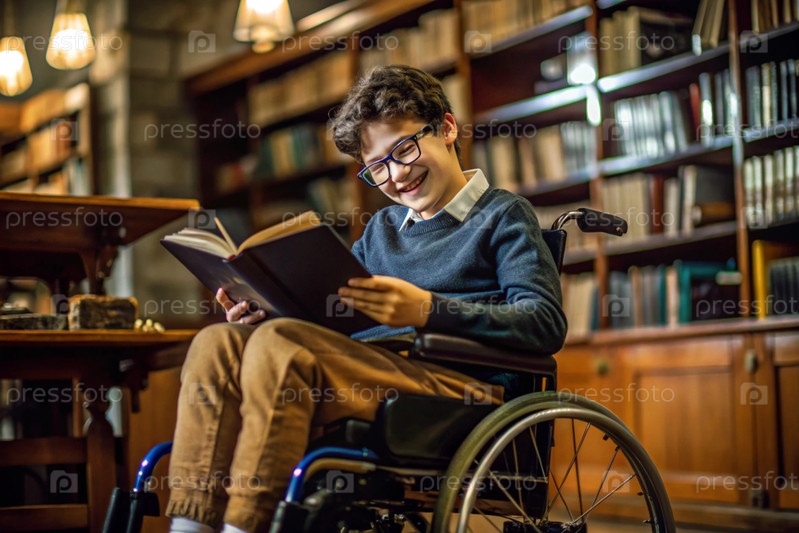 Инвалидность.Ребенок с инвалидностью в коляске читает книгу в библиотеке.Здоровье и медицина