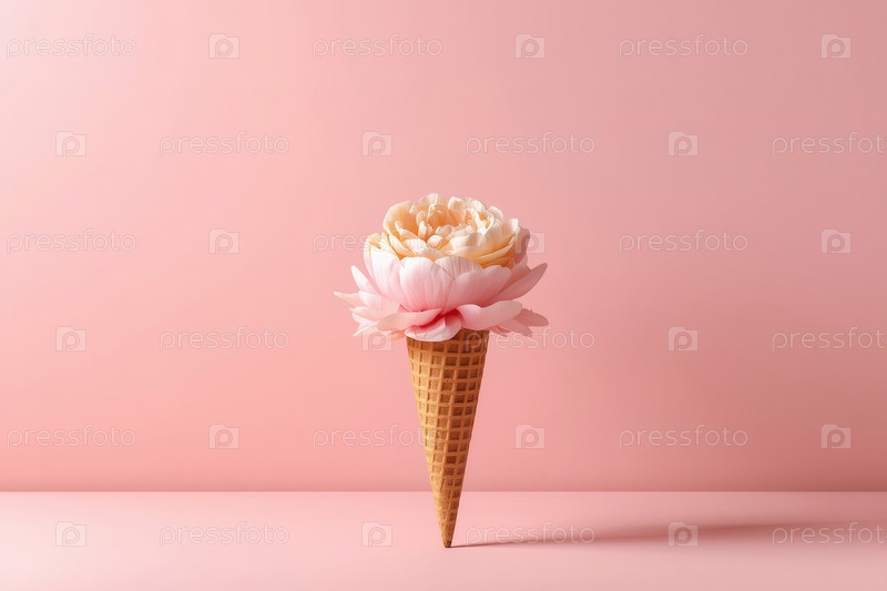 Минимальная студийная фотография. Вафельный конус. Наполненный тонкими пастельными цветами, напоминающими пионы или розы, с многослойными лепестками в мягких розовых и персиковых оттенках на розовом фоне