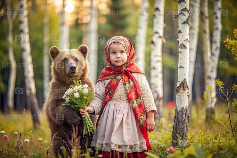 Красивая маленькая девочка в русской народной одежде и с платками на голове в березовой роще с живым медведем Русский фольклор, славянская мифология