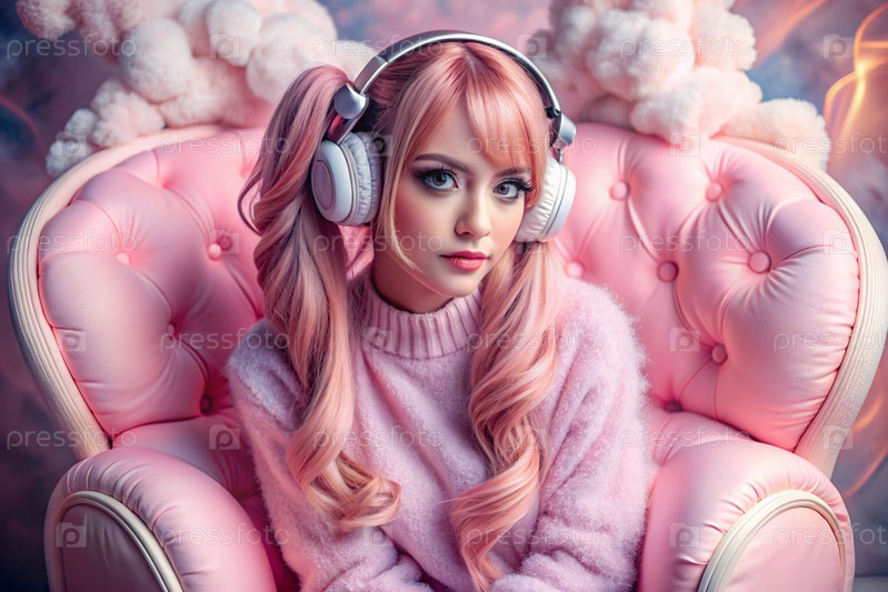 Молодая красивая японская девушка с розовыми волосами в аниме слушает музыку на беспроводных наушниках в розовых облаках