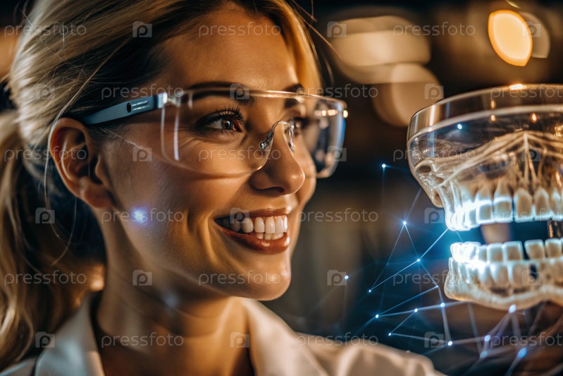 Новые технологии цифрового искусственного интеллекта в зубных протезах. Имплантаты. Женщина-стоматолог с идеальной улыбкой и цифровой графикой на виртуальном экране