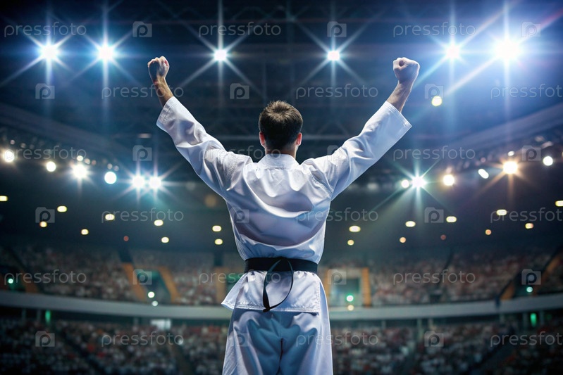 Спортсмен по каратэ с гордостью поднимает руки на стадионе в свете фонарей и прожекторов после того, как стал олимпийским чемпионом