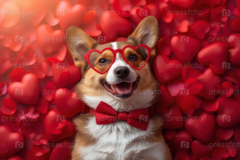 Красивый баннер на День святого Валентина с влюблёнными собаками и красным сердцем. Вид сверху. Романтическая и любящая атмосфера