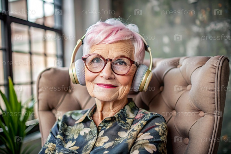 Стильная, современная, счастливая 60-70-летняя женщина слушает музыку в больших беспроводных наушниках дома, на стуле в гостиной