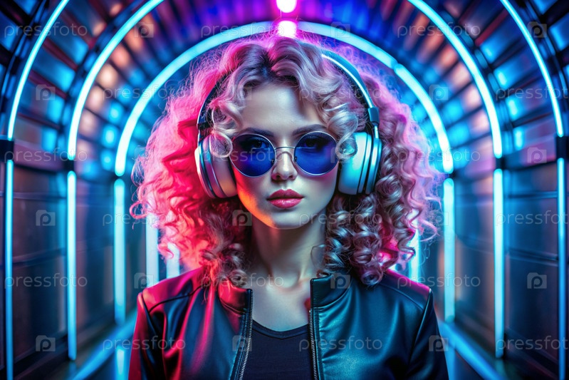 Молодая красивая девушка в солнцезащитных очках слушает музыку на больших беспроводных наушниках, стоя в неонном туннеле среди неоновых вывесок