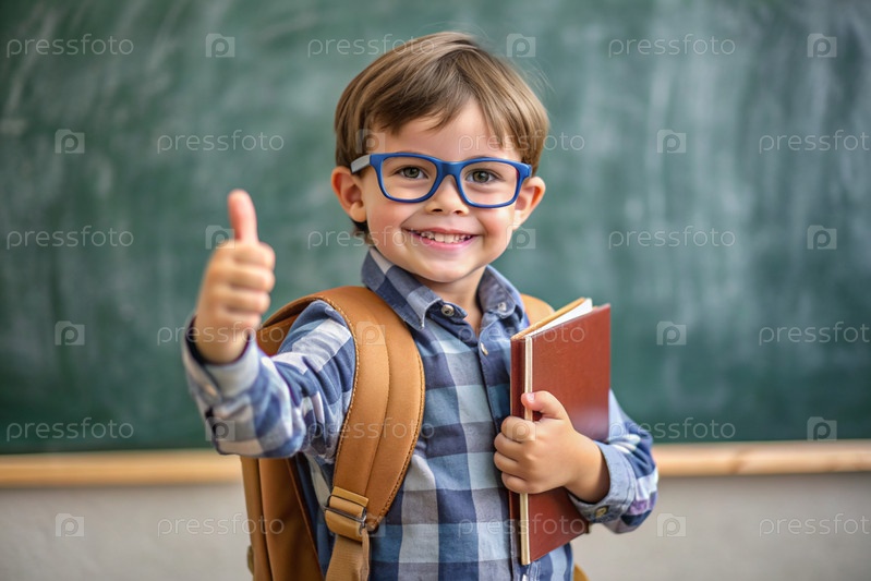 Мальчик с очками показывает класс своей рукой. Ребенок впервые идет в школу. Ребёнок со школьной сумкой и книгой. Ребёнок в классе с доской на заднем плане. Возвращение к школе