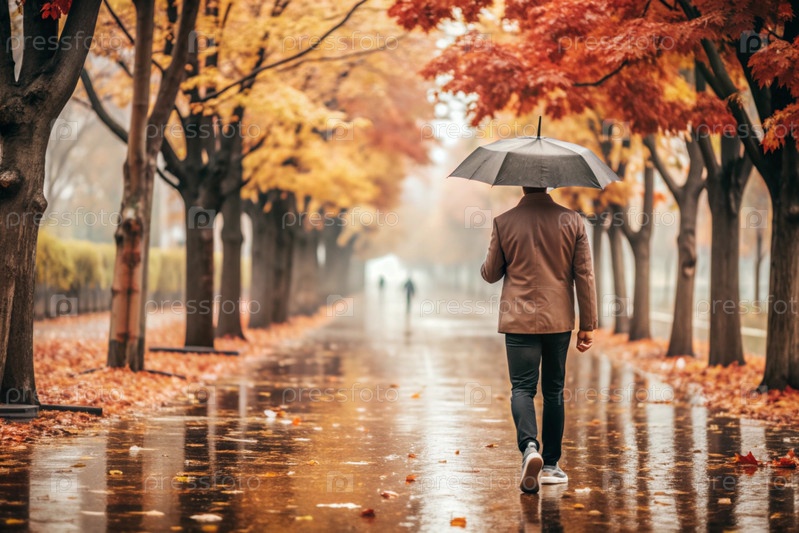 Мужчина под зонтиком идет по осенней аллее в парке