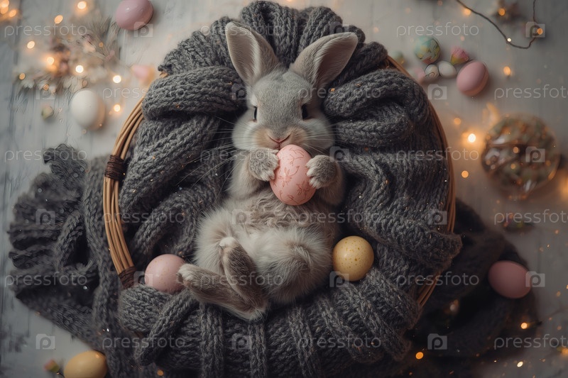 Пасхальный кролик держит пасхальное яйцо в лапах, лежит на спине на сером вязанном одеяле и смотрит в камеру
