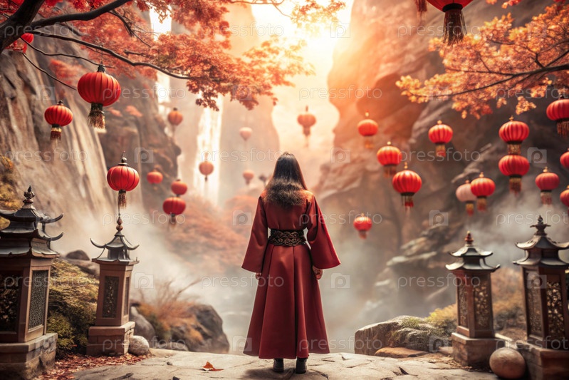 Японская девушка в традиционном национальном костюме - кимоно. На сказочном фоне фонарики и осенние деревья. Портрет символизирует традиции и культуру народа Японии