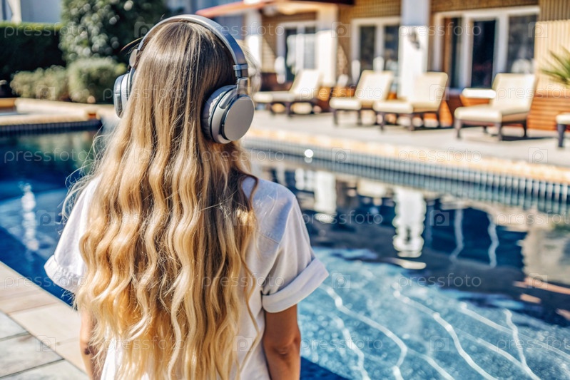 Молодая девушка слушает музыку с помощью больших наушников, стоит у бассейна спиной к камере
