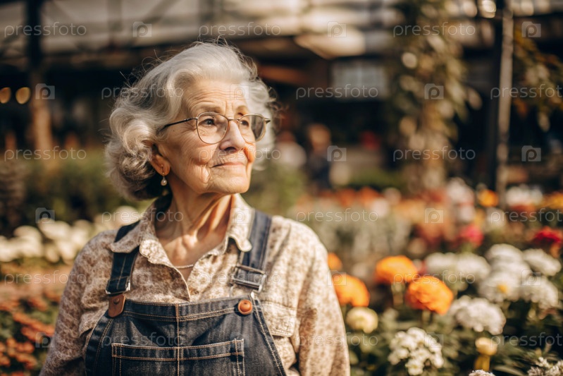 Пожилой садовник с седыми волосами в комбинезоне в уютной цветочной теплице