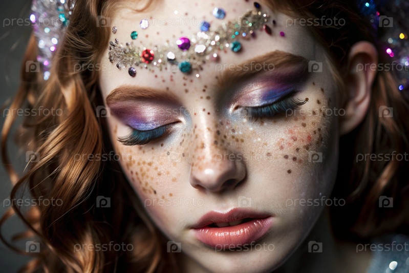 Покрытие лица девушки праздничным макияжем и ленточками.Изображение придает ей сказочный и мистический вид.Концепция новогодней ночи или дня рождения