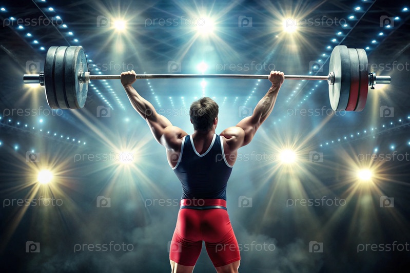 Соревнования по тяжелой атлетике. Спортсмен берет на себя большой вес штанги. Спорты летних Олимпийских игр