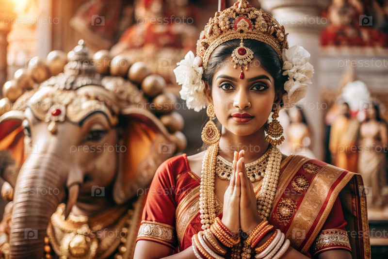 Красивая индийская девушка в традиционном национальном костюме, сари. со слонами. портрет символизирует традиции, культуру и красоту народа Индии