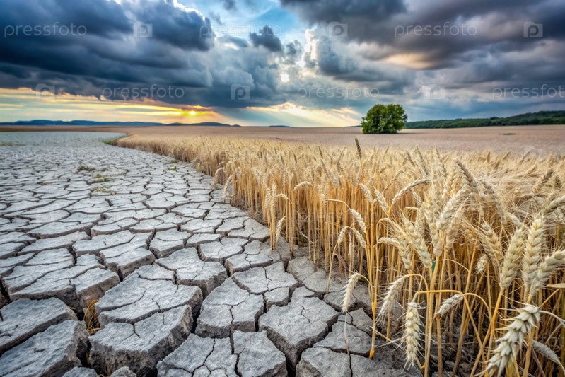 Концепция глобального потепления на планете Земля. Сухая и треснувшая земля и поле пшеницы. Пшеница фермера мертва, мертва, высохла. Последствия изменения климата