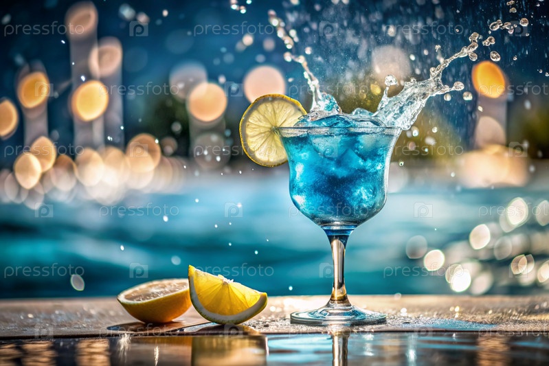 Стакан вкусного голубого коктейля 'Голубая лагуна' на фоне бассейна. алкогольный коктейль сочный фруктовый синий с ликером Curacao, кубиками льда и ломтиком лимона