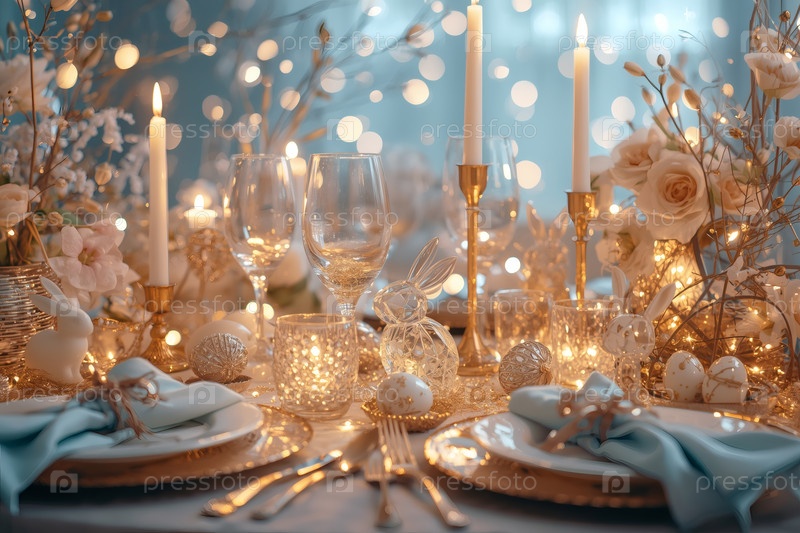 Пасхальный баннер 2026. декоративная тарелка, столовая посуда, стаканы, пасхальные яйца и кролики. концепция празднования Пасхи для кафе и ресторанов