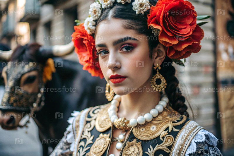 Испанская девушка в традиционном испанском национальном костюме. Перед быком. Бикоборство. Портрет символизирует традиции и культуру народа Испании