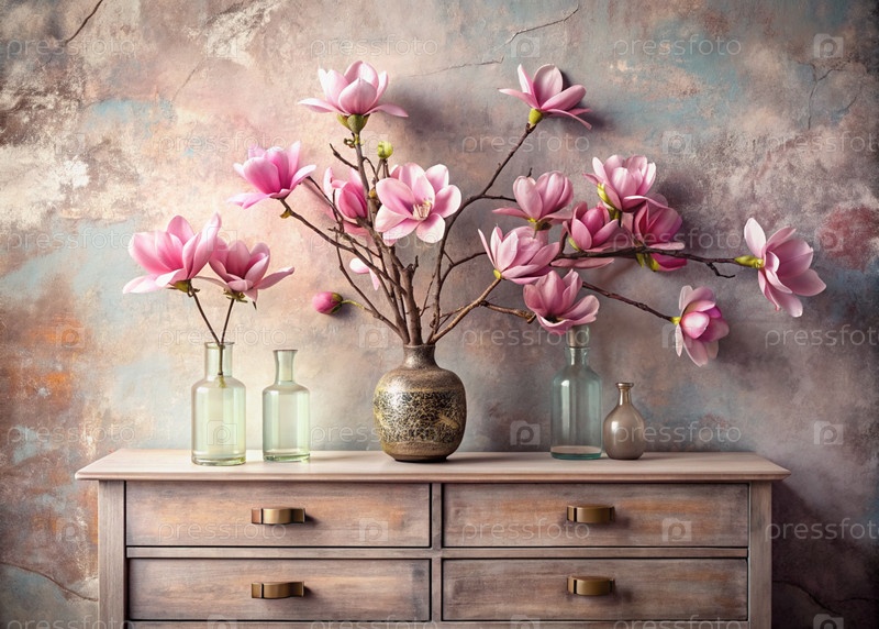 Красивая ветвь розовой магнолии в стеклянной вазе и флаконы на старом деревянном шкафу. Букет цветов в вазе в интерьере дома. Светлый, бежевый, розовый цветочный фон