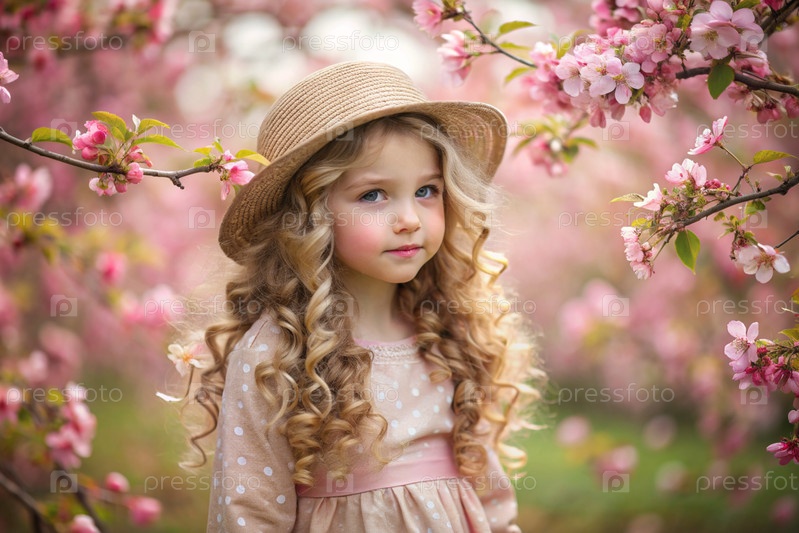 Портрет красивой маленькой кудрявой 4-летней девочки в соломенной шляпе и платье в цветущем розовом саду яблок. Детство. Ребенок позирует и смотрит на камеру