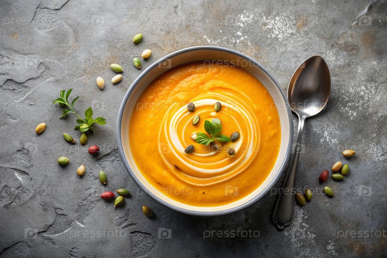 Традиционный мягкий тыквенный кремовый суп с сливками и семьями тыквы на сером бетонном фоне