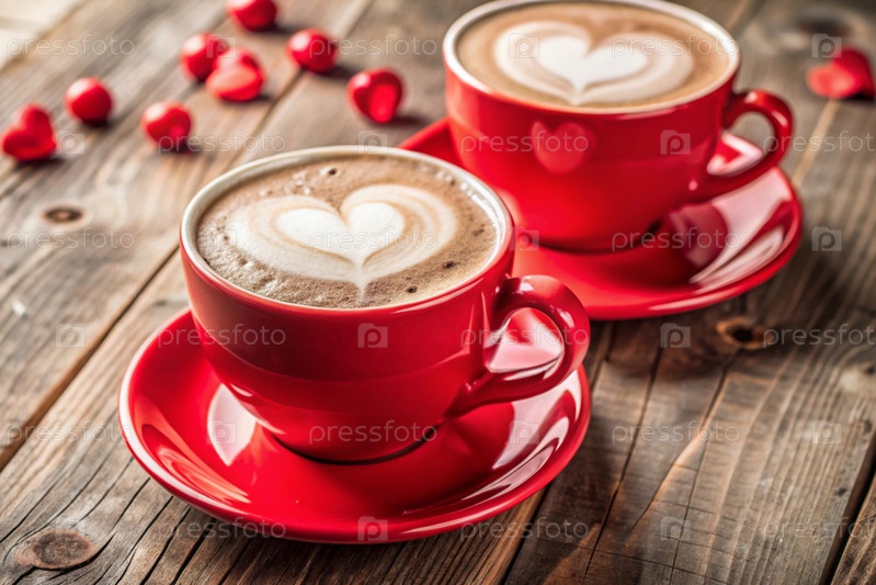 Концепция Дня святого Валентина для кафе и ресторанов красные чашки кофе латте с сердцами вокруг горячие напитки для влюбленных