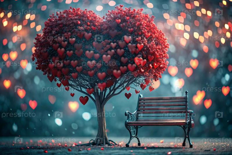 Красивое фантастическое дерево в форме сердца, сияющее среди деревьев парка и скамейка для влюбленных на сказочном фоне боке-стиля