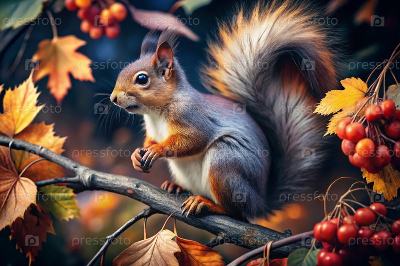 Портрет красивой красной пушистой белки на ветке осеннего дерева с красными ягодами