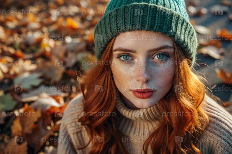 Осенний портрет. Близкий план молодой рыжеволосой женщины с выразительными зелеными глазами в вязанной шляпе и свитере