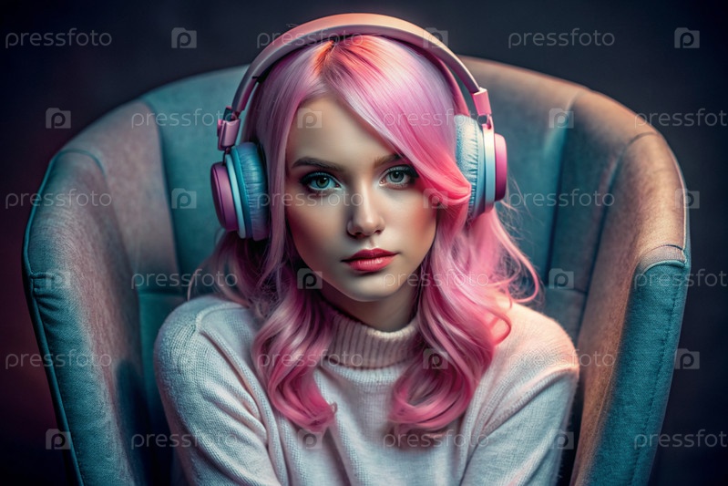 Молодая красивая девушка с розовыми волосами слушает музыку в больших беспроводных наушниках дома, на стуле в гостиной