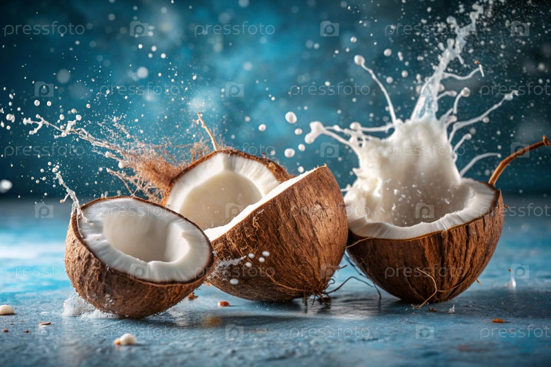 брызги кокосового молока и пальмовых листьев. Брызги молока - кокосы на синем фоне. Баннер для сладостей, курортной косметики или кремов по уходу за телом и лицом