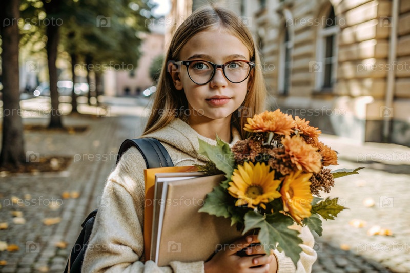 Красивая девушка с очками и букетом осенних цветов впервые идет в школу. Ребенок со школьной сумкой, книгой и цветами. Малыш на городской улице