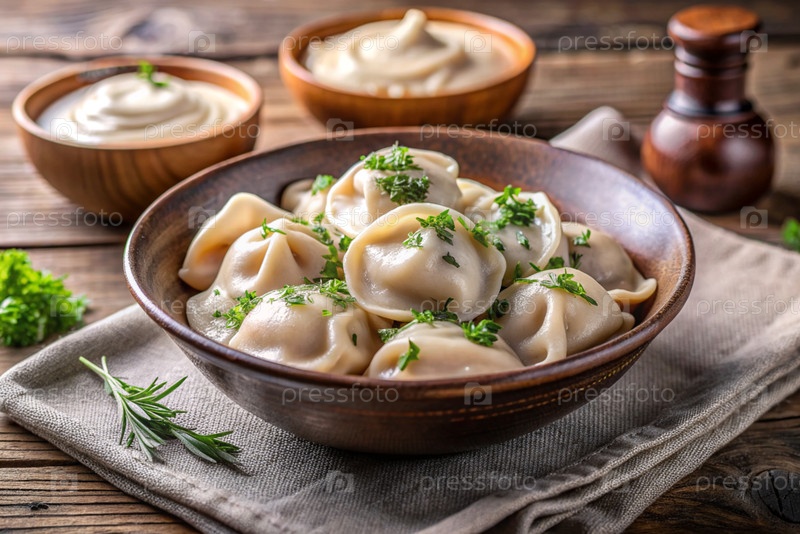 Русская кухня, пельмени в керамической миске с сметаной и травами