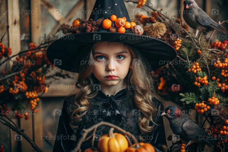 Осенний портрет красивой девушки в костюме ведьмы с осенними ягодами, тыквами и черными птицами. баннер, открытка. концепция Хэллоуина