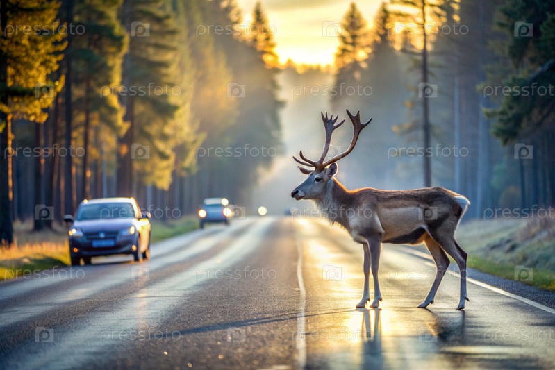 ДТП.Животное - это олень на дороге возле леса рано утром.Дорожные опасности, дикая природа и транспортное средство
