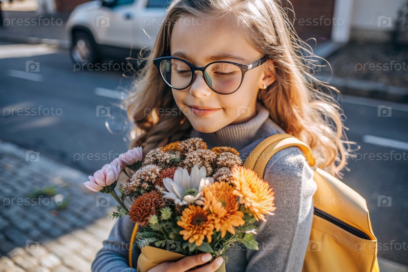 Красивая девушка с очками и букетом осенних цветов впервые идет в школу. Ребенок со школьной сумкой, книгой и цветами. Малыш на городской улице