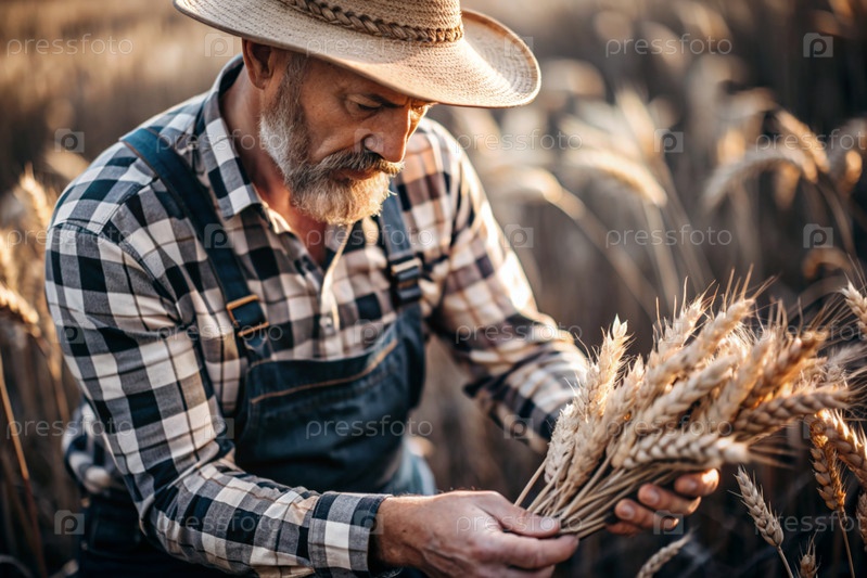 Фермер-мужчина держит золотые колосья пшеницы на фоне созревающего поля. Близкий план фермера. Концепция посадки и сбора богатого урожая. Сельский пейзаж при закате солнца