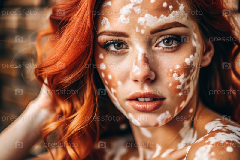 Лейкодермия. Витилиго. Плохая пигментация кожи. Большие белые пятна по всему телу и лицу. Портрет красивой девушки с кожными заболеваниями