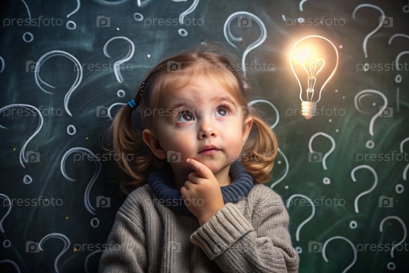 Развитие и образование детей. Вдумчивые девочки на темном фоне с лампочкой и вопросительными знаками. Брайнсторминг и концепция идеи