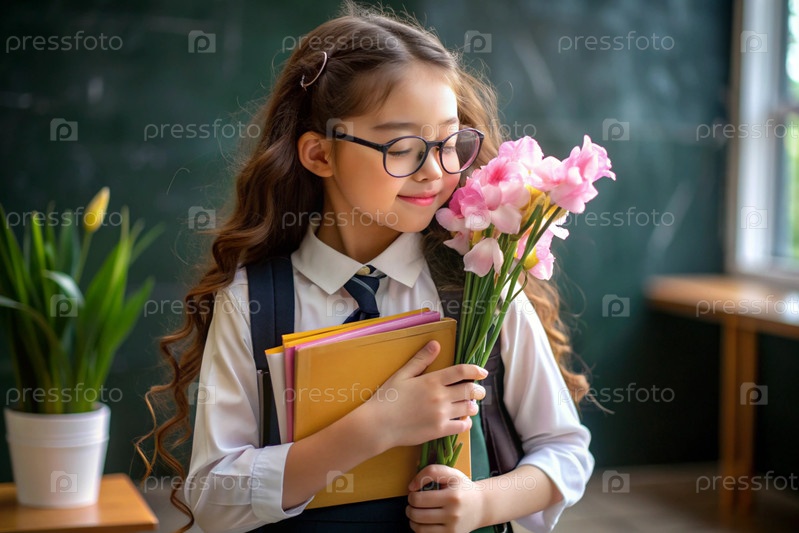 Милая, красивая первоклассница с очками. Букет цветов. Ребенок впервые идет в школу. Ребёнок с рюкзаком, книгой и цветами. Возвращение к школе