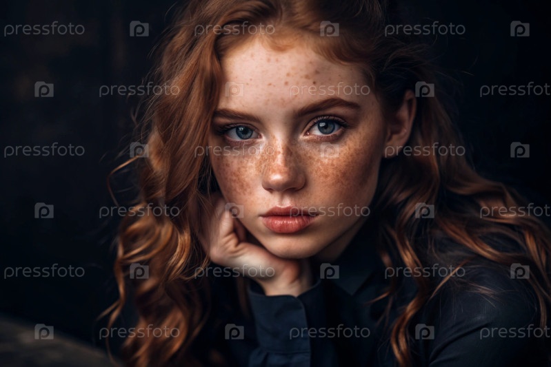Глубокий эмоциональный портрет.Лицо молодой девушки без макияжа, с выразительными глазами, кудрявыми красными волосами и веснушками на лице. Естественная женская красота